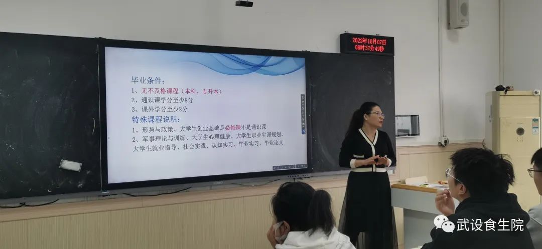 会上方娜简单介绍了2023届毕业生的基本情况,以及目前的老员工就业形势。提供了多条人生规划建议,鼓励同学们选择国家和社会真正需要的岗位,助力同学们更好地踏上求职之路。王影讲解了毕业所需要满足的条件:无不及格课程,通识课学分至少8分、课外学分至少2分等。并展示了部分还未满足条件的同学,举例讲解了补救方法。