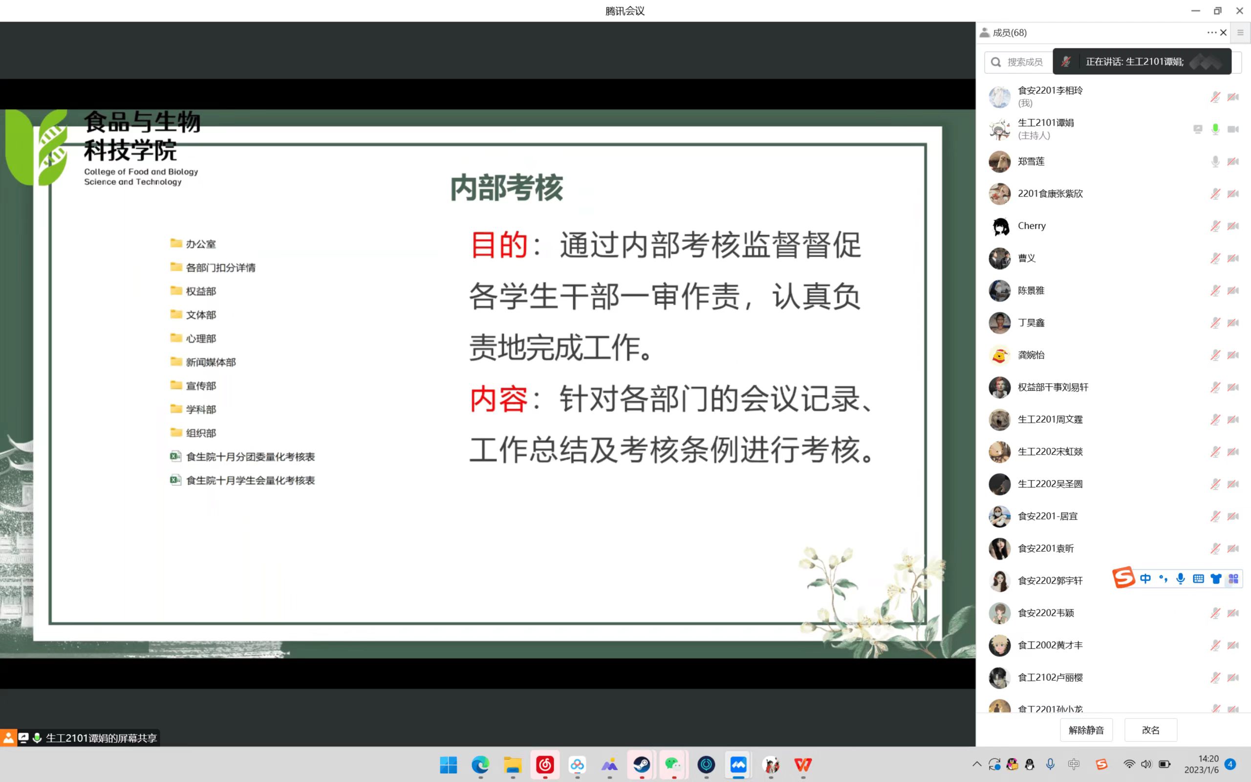 (通讯员 兰静茹 李相玲)为了总结回顾本学期员工会的各项工作,进一步开展和落实新学期的工作任务。公司于1月6号14:00以线上方式召开了2022-2023-1学年第一学期分团委员工会述职评议大会。参加本次会议的主要有分团委负责人张智、21级辅导员朱广寿、22级辅导员龚婉怡及分团委员工会全体成员,此次会议由员工会办公室工作人员袁昕主持,由分团委员工兼职副书记、主席团成员及各部门主要负责人对本年度的工作进行总结。
