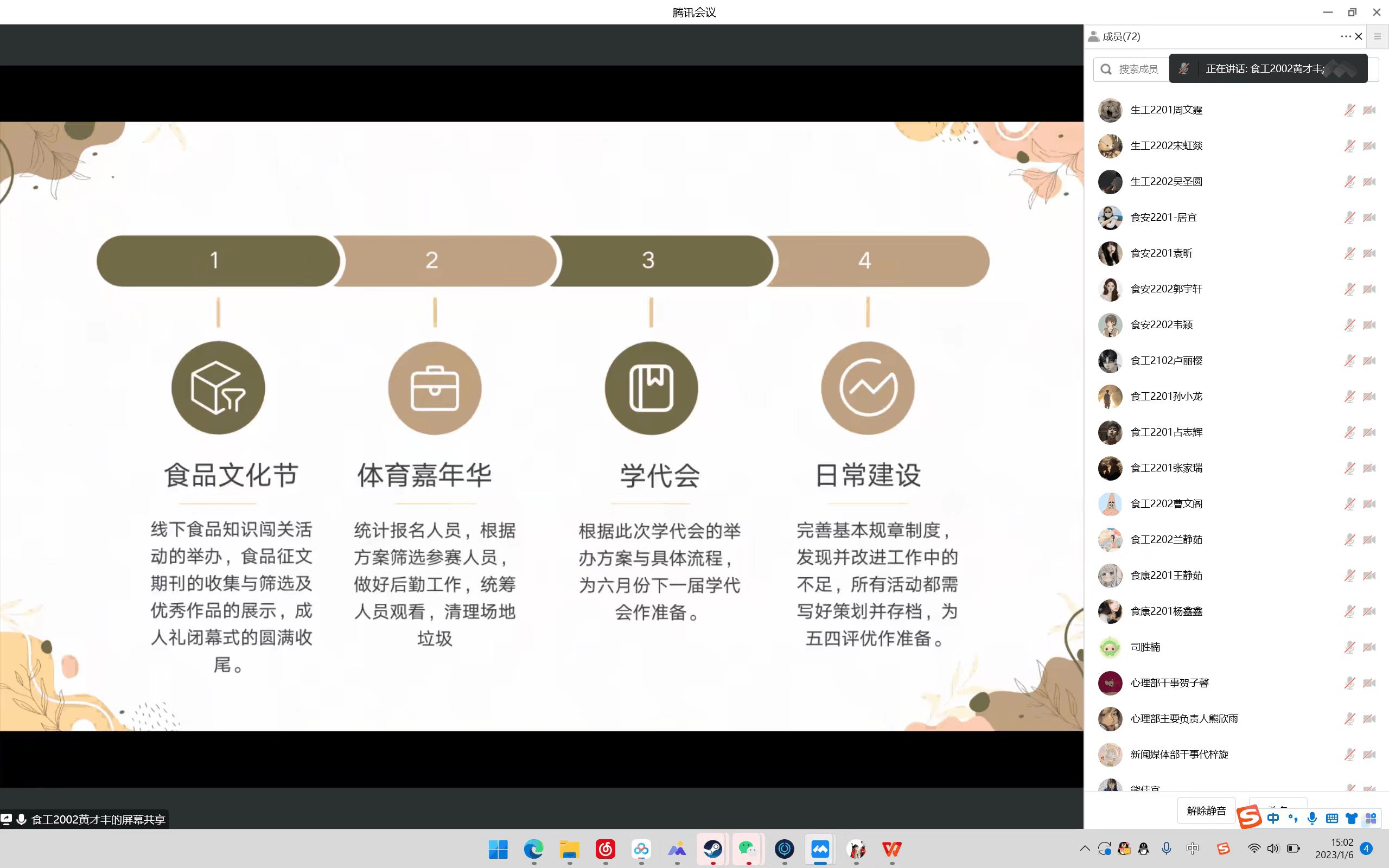 首先,各部门主要负责人依次进行述职汇报,分别从工作回顾、完成情况、不足与改进及未来计划四个方面进行汇报。脉络清晰,内容详实,充分展现出员工组织的活力与创造力。其次,分团委员工兼职副书记郑雪莲发言。她对分团委各部门的发言进行总结,也对接下来的工作提出了要求:尽可能“沉下来工作”,加强部门的联系,工作更细心等等。紧接着,由主席团成员进行述职汇报,总结工作上取得的成绩与不足,提出改进的措施与工作计划,并表示要充分发挥员工干部的模范带头作用,冲锋在前,彰显青春底色。