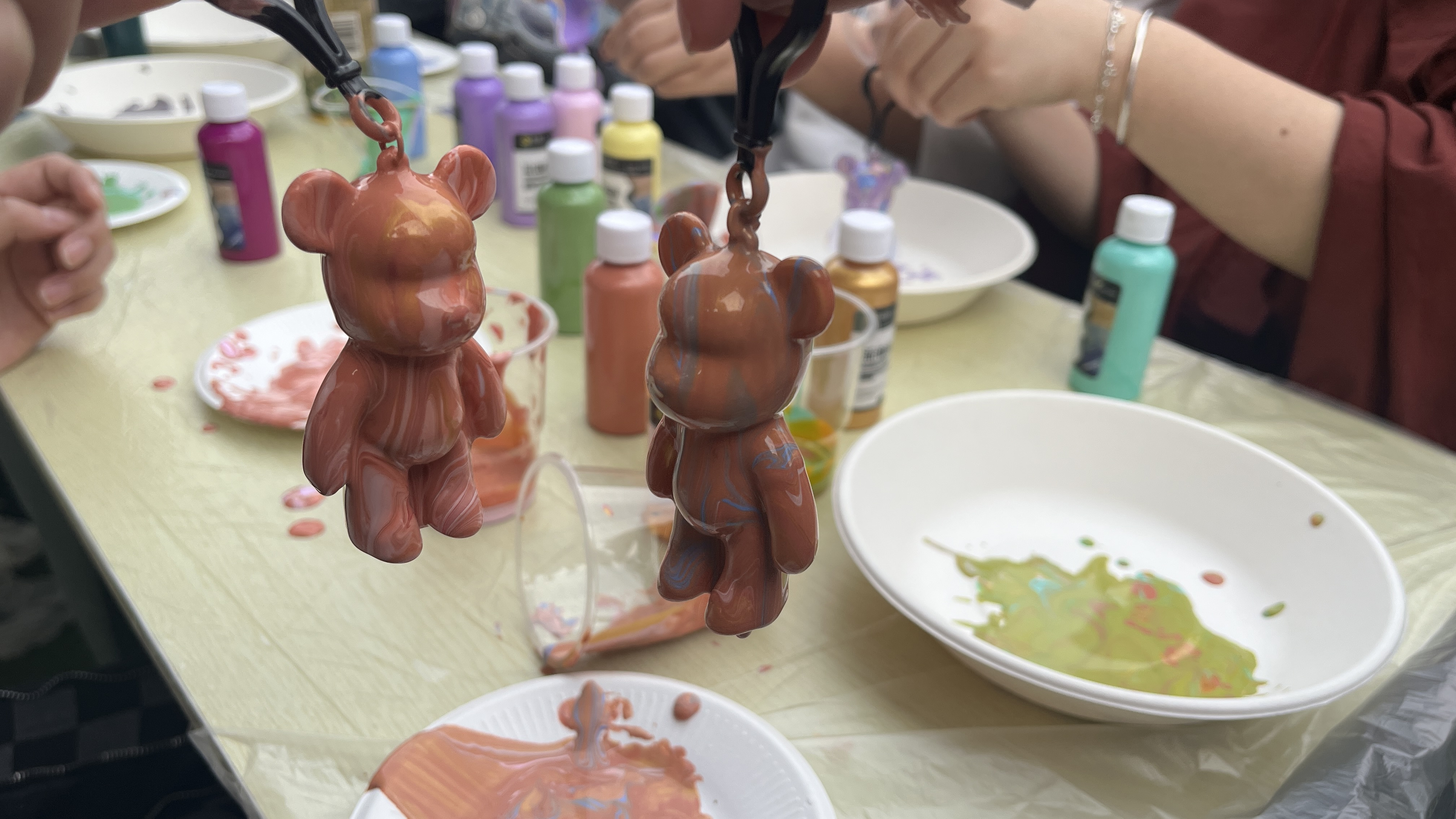 活动期间,同学们积极参与,他们手持纸杯和染料瓶将自己喜欢的颜色,一层一层的铺到杯底,整个过程十分火爆,不一会儿,我们放置晾干的绳子上就挂满同学们的小熊了。