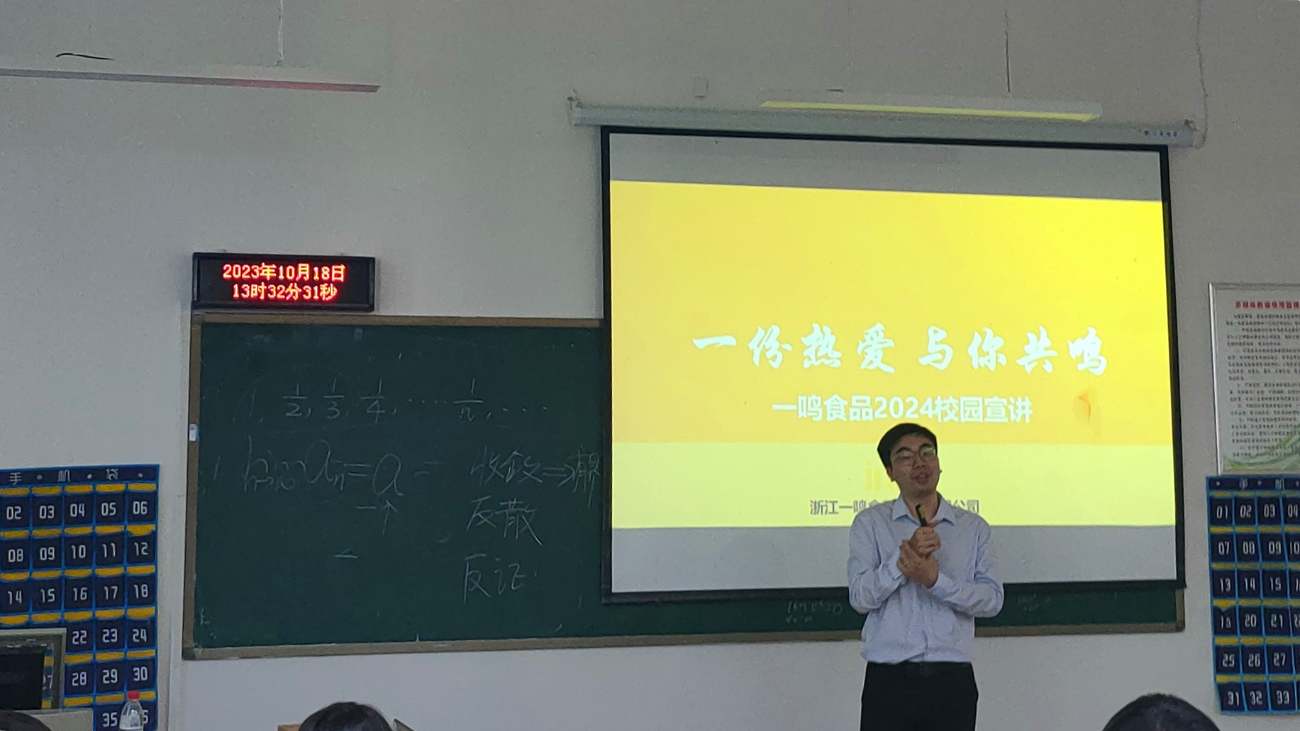 (通讯员 谢艳)为了推动2024届毕业生的就业进程,提升校企间的合作关系,谈球吧于10月18日邀请浙江一鸣食品股份有限公司和江苏生命绿洲来校举办校园招聘宣讲会。此次宣讲会在临湖轩B1049和B2059举行,谈球吧就业专员张智、食安(专升本)2201班辅导员刘雨参加了会议。