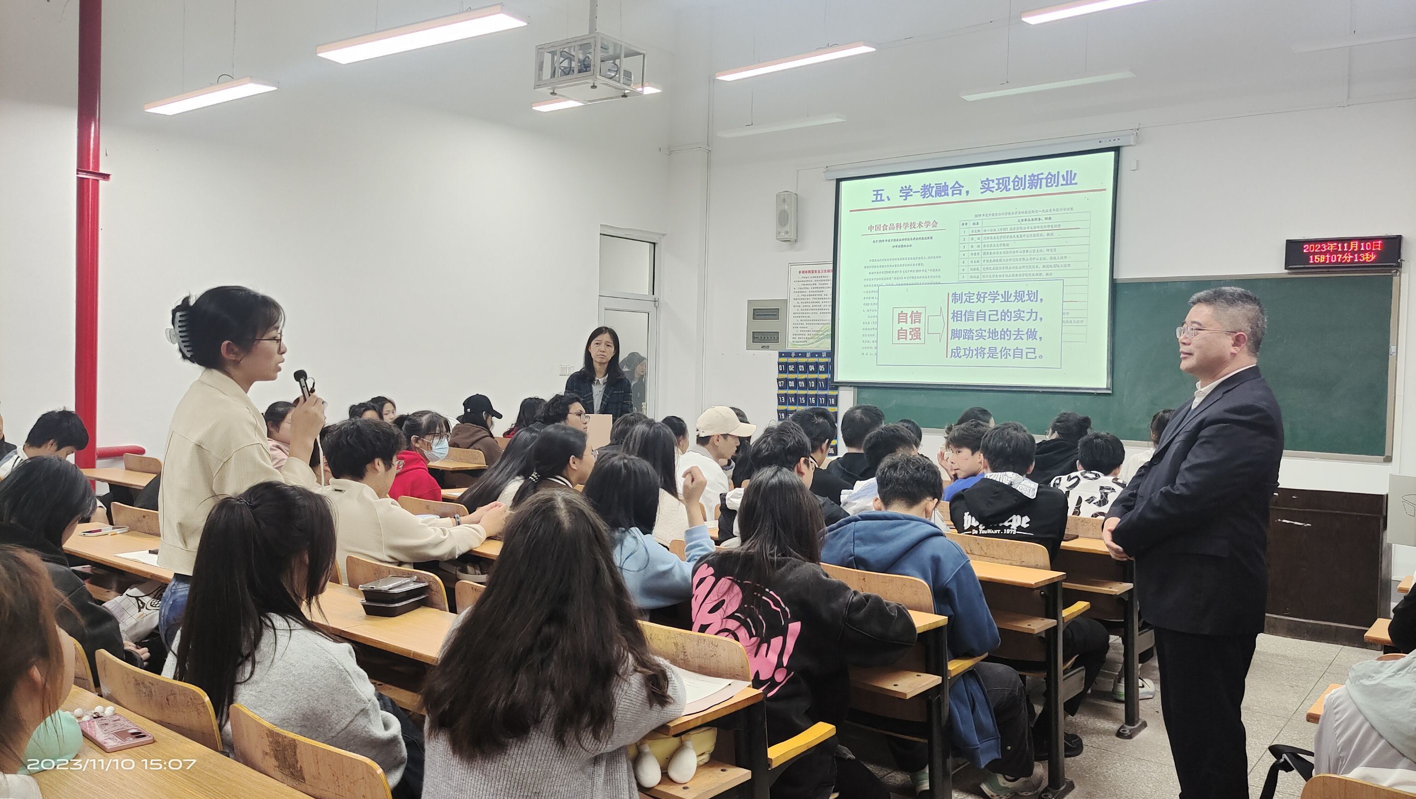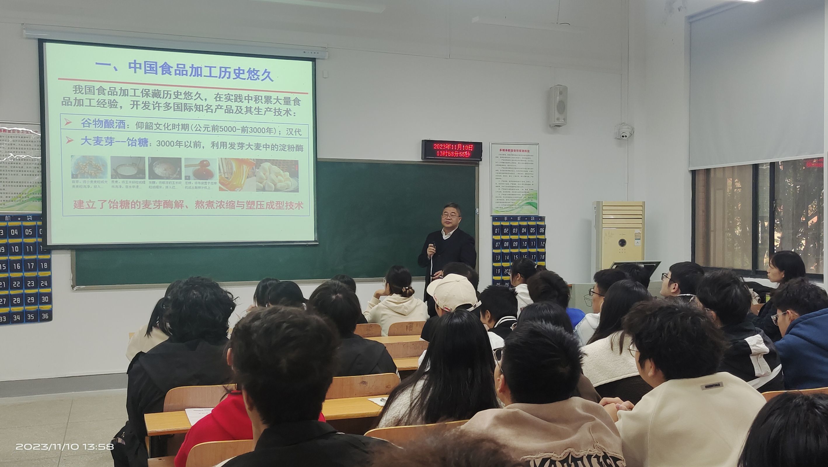熊教授先带领同学们回顾了中国食品的加工历史,从仰韶文化时期的谷物酿酒到大麦芽饴糖的制作,让同学们认识我国古代食品加工贮藏技术的在世界同时期的先进性,感受我国古人智慧的同时增强民族自信;接着,熊教授讲述了食品工业成为我国第一大产业的历程,以“实施食品安全战略,让人们吃得放心”以及“大食物观”为切入点,为同学们分析了国家对食品安全与健康的重视,让同学们了解了食品行业的发展前景和机遇;随后,熊教授还为同学们介绍了食品工业未来发展的四大趋势,让同学们明确自己未来就业的方向;最后,熊教授告诫同学们,大学期间应当着重培养四大能力,即学习能力、思维能力、解决问题的能力以及沟通能力,并对同学们如何规划好老员工活和学习,提出应合理定位、个性发展的建议。