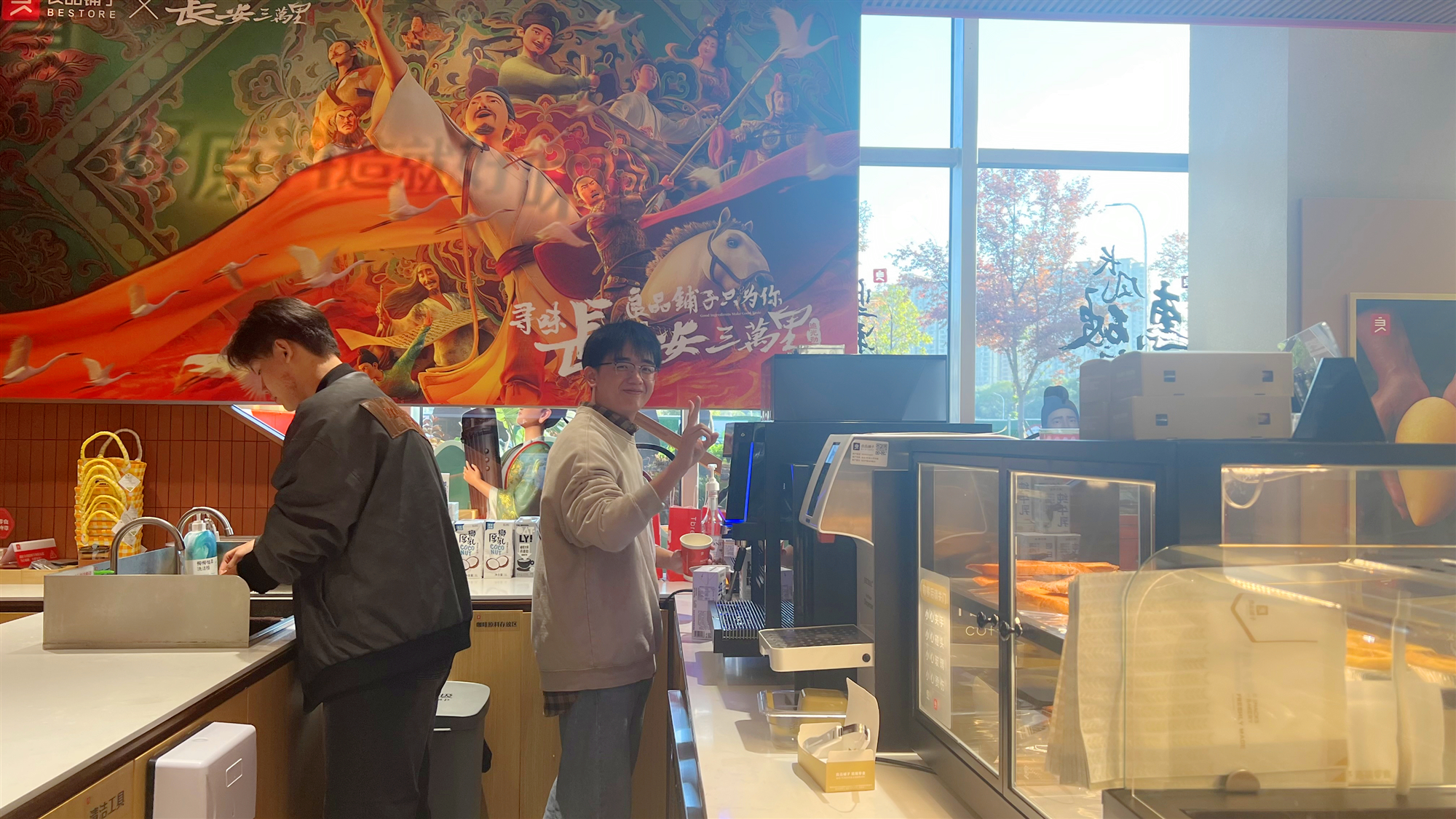 签约仪式后,众人移步到良品大厦楼下的良品爱心公益店参观,直观了解门店的工作环境,实习员工生们为老师们现场制作咖啡、烤肠,展现实习期的门店工作技能。