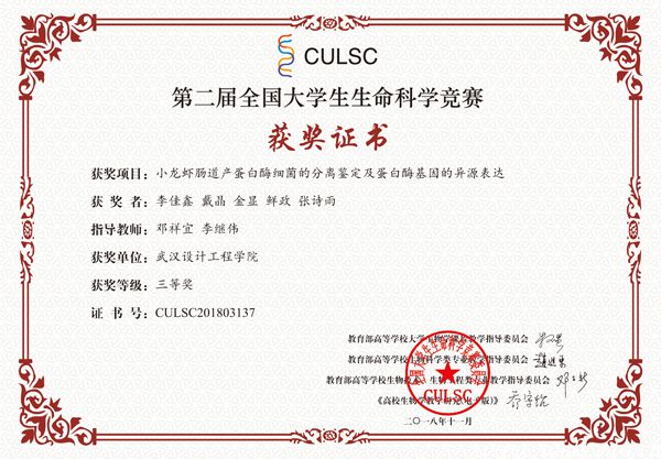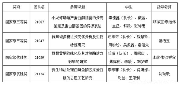 本网讯(通讯员 邓祥宜)近日,谈球吧接到喜讯,在刚刚落幕的第二届全国老员工生命科学竞赛上,公司学子获得国家级三等奖2项、国家级优胜奖2项共四项大奖。其中,“小龙虾”团队(详见公司学子研究小龙虾获湖北省老员工生物实验技能竞赛一等奖)再次摘得荣誉,所有获奖团队信息如下: