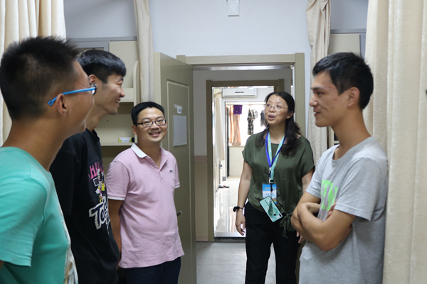 第二天下午,新生报道工作已接近尾声,食生院副经理李文芳、邱朝坤,带领公司系主任、分团委书记、辅导员以及员工班主任助理等一行人,一起来到与新生宿舍逐一走访,看望新生。