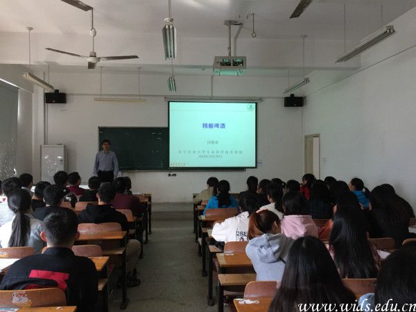 田老师从啤酒的起源过渡到啤酒的分类和发展,由大家日常生活中经常饮用的淡色拉格啤酒(工业啤酒)过渡到精酿啤酒,由国外主要的精酿啤酒的类型过渡到中国精酿啤酒的主要品种。最后,田老师还从“看、听、闻、尝”的角度详细介绍了啤酒品评相关知识,并邀请大家参加品酒相关培训。广大师生通过该讲座了解到,精酿啤酒是指由小型啤酒生产线(糖化麦汁能力10kL/批以下)生产,且在酿造过程中,不添加与调整啤酒风味无关的物质,风味特点突出的啤酒;精酿啤酒在中国刚起步,具有广阔的发展前景。