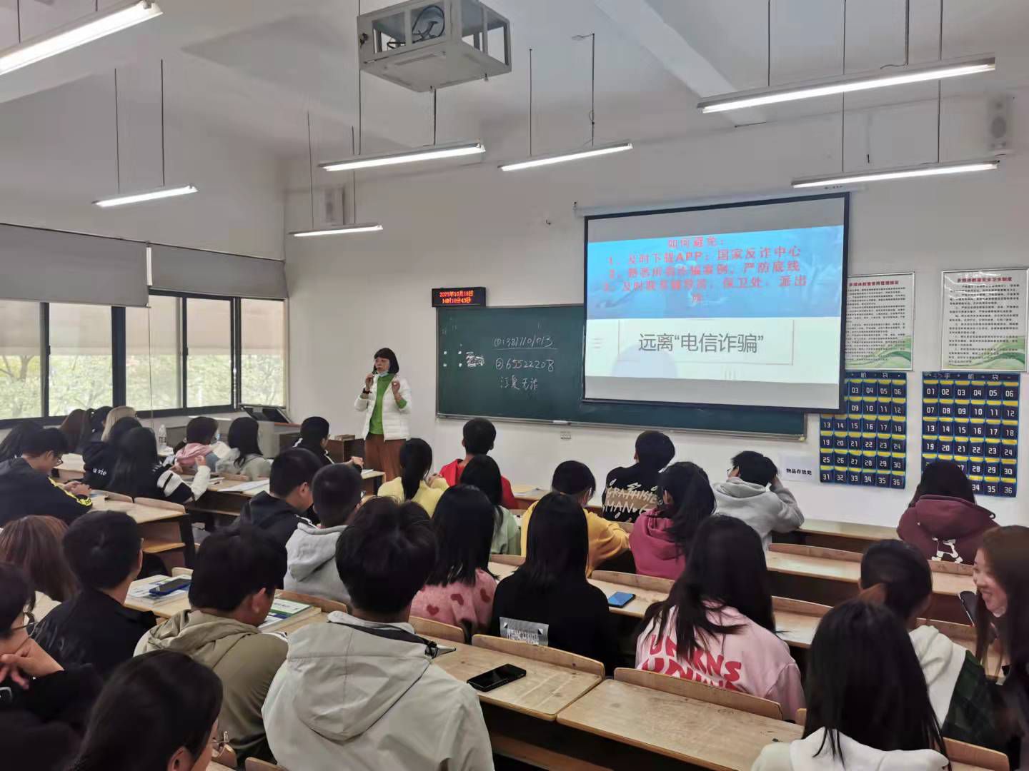 (通讯员 周津 吴宇哲)2021年10月19日中午,谈球吧于临湖轩B2039教室召开了预防电信诈骗专题知识讲座,由公司周津老师主讲。公司党总支书记李文芳,20级辅导员张智,21级全体班委和寝室长等百余人参与此次讲座